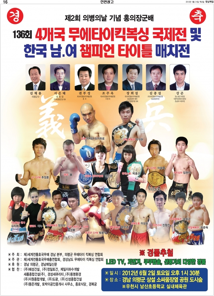 2012년 6월 9일 의병의 날 기념 홍의장군배 무에타이 킥복싱 국제전 및 한국 남여 챔피언 타이틀 매치전을 경남 의령군 상설 소싸움장옆 공원 도시 숲에서 개최합니다. 오랜 준비와 기다림으로 열릴 행사이니만큼 더욱 성공적으로 개최될 수 있도록 많은 관심과 성원을 부탁드립니다.